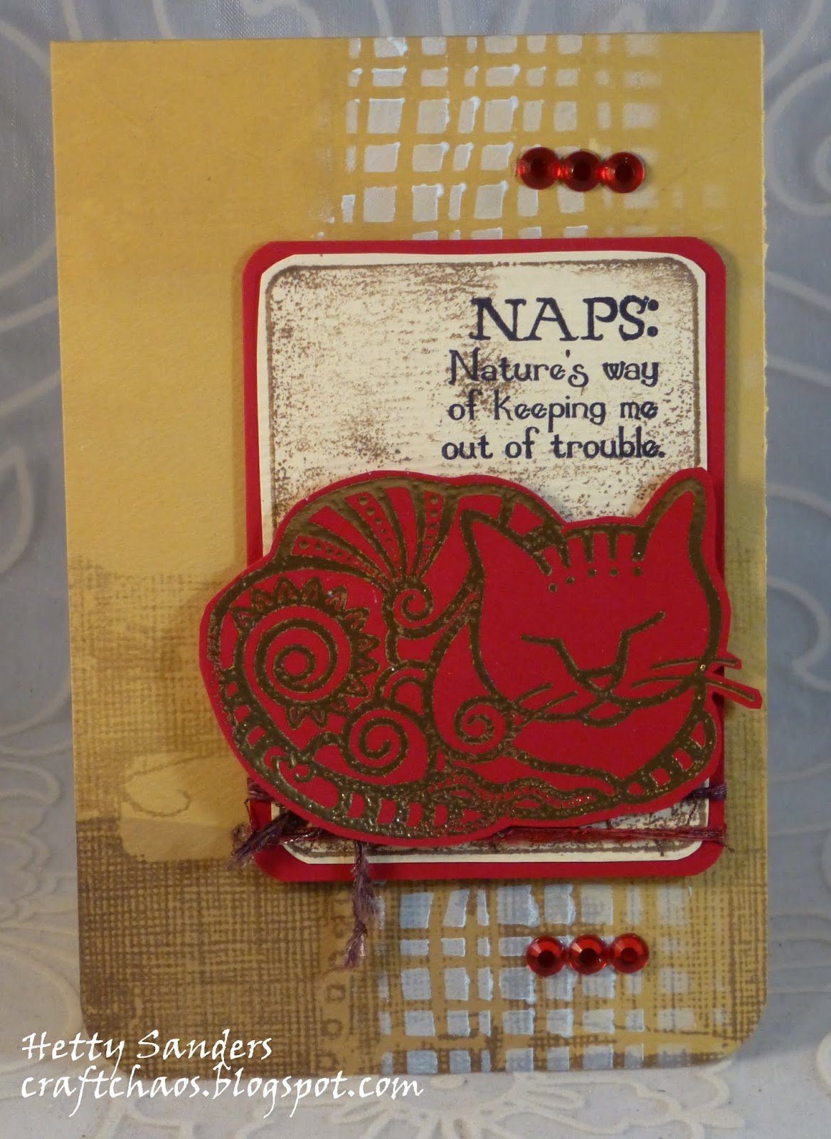 I have never looked at a nap that way...I better start napping more! Haha! I love your grey kitty on the red paper. It is amazing how it shows through. Love your grey edge on your card to pull it all togethe